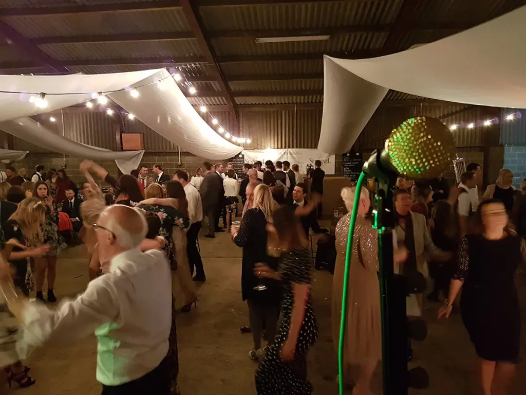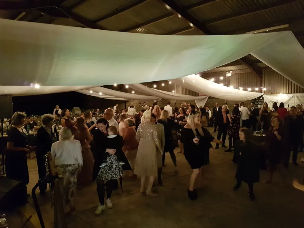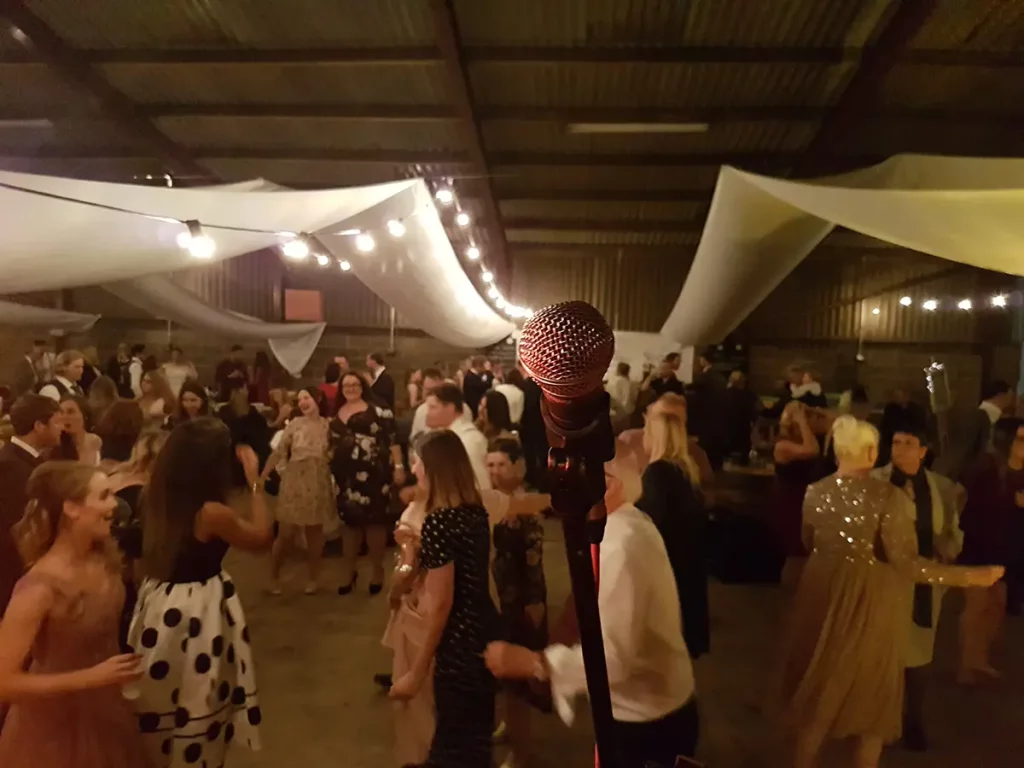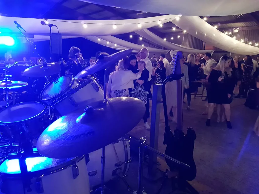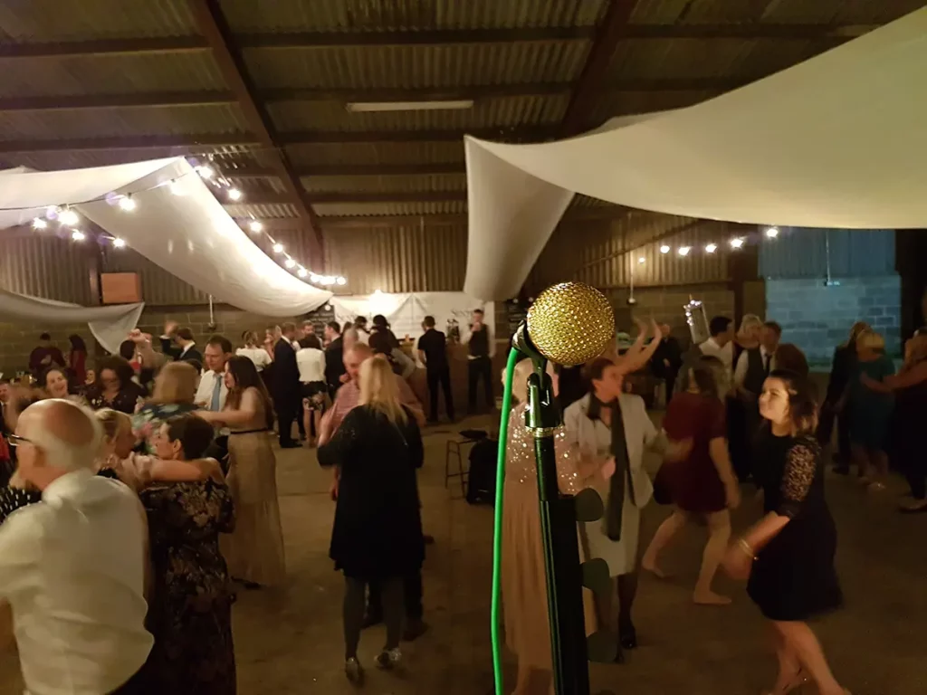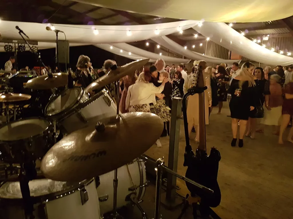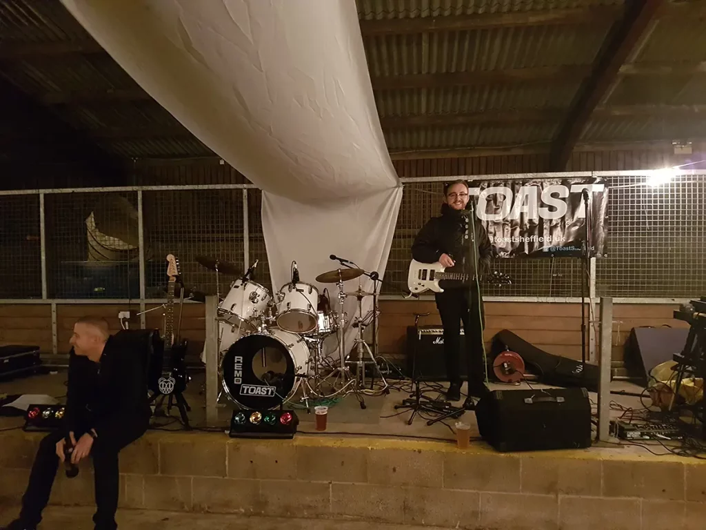 An unusual one this. The venue was a barn made of breeze blocks and corrugated iron on a farm on the outskirts of Sheffield. The so called “stage” was a narrow , raised concrete path that was probably intended to allow a farmer to more easily navigate a herd of cattle. Happily it also worked with wedding guests. The narrowness of the stage forced us to adopted what is known as the “firing squad” formation, with each so called musician, standing side-by-side in a row. Although this configuration can be made to work, it’s difficult for bandmates to make eye contact with each other and is therefore not ideal.